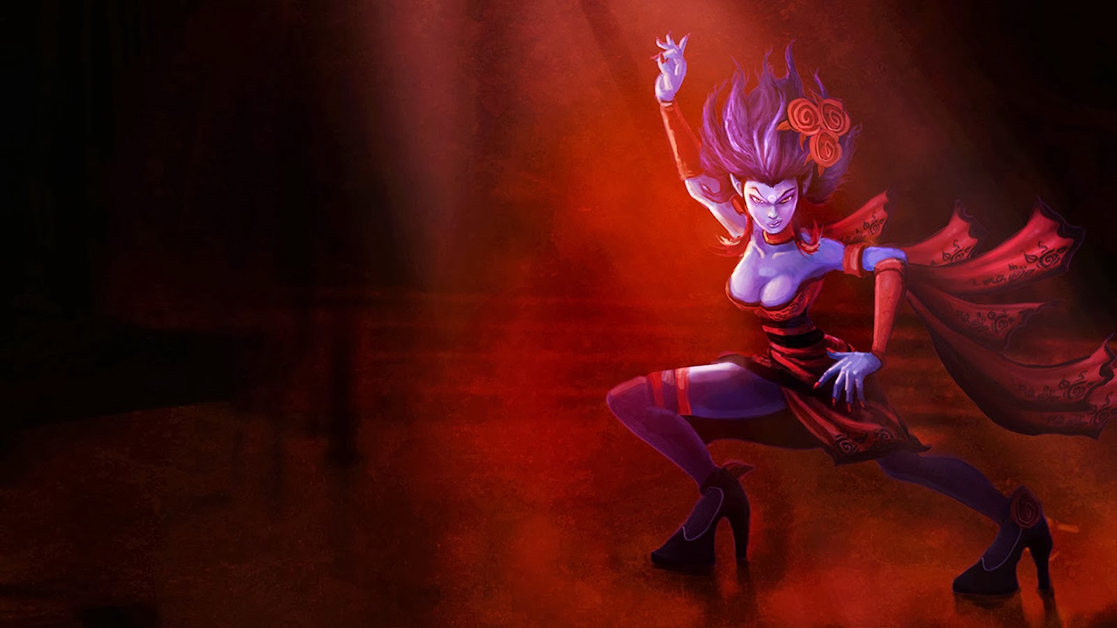 Evelynn's origins are shrouded in mystery - a mystery she herself helps to perpetuate. What everyone does know about Evelynn, however, is that she is one of the most skilled assassins in Valoran. It is clear upon first meeting her that she is not quite human. Some theorize that she was cursed with a mild form of fantastical vampirism as a child. Supporters of this theory contend that her ability to sap the very life essence of her opponents on (and off) the Fields of Justice, while still being able to tolerate direct sunlight, would account for this belief. There is some evidence that Evelynn originally came from the Shadow Isles - the mysterious island located northwest of Valoran that is eternally blanketed by a thick, unnatural fog. It is thought that the Shadow Isles are home to countless forms of undead, though no one seems eager to perform the exploration necessary to find out the truth. Evelynn neither confirms nor denies her connection to Shadow Isles.
