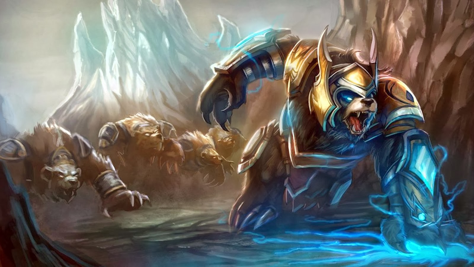 Volibear rushed down the mountainside to recount what he had seen, but found the path blocked by three Ursine - the triumvirate. Knowing he would end the lasting peace, they refused to heed Volibear's warning and demanded his silence, by his word - or his death. Resolute and adamant, Volibear swore that the Ursine's very survival depended on his message, and launched into ferocious combat against the three. A terrible clash ensued, and just as Volibear succumbed to his opponents, he called upon the power of the maelstrom. Unleashing raw lightning, he struck the trio down with a thunderous blow. Stunned and astonished, the triumvirate beheld the sign of Ursine leadership: the force of the sacred storm.